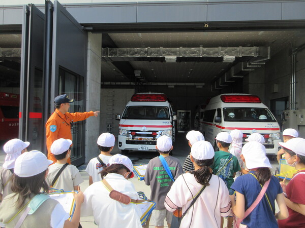 社会科の学習の一環として「さいたま市中央消防署」に見学に行きました。消防署内での生活のことやさまざまな種類の消防車についてなど、たくさんのことを教えてもらいました。